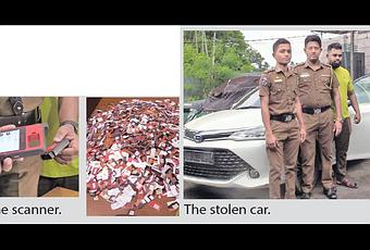 Thalangama Police arrested two suspects who stole a car valued around Rs.10 million belonging to a bank officer, which had been parked in the car park at a medical center in Thalawathugoda within 24 hours. The stolen car with the two suspects, a modern machine with software used to scan and start the car which had been used in the robbery, the car in which the suspects had come for the robbery, nearly 2,000 different types of SIM cards have been taken into police custody.