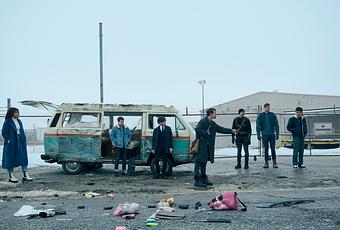 (L to R) Emmy Raver-Lampman as Allison Hargreeves, Elliot Page as Viktor Hargreeves, Aidan Gallagher as Number Five, Robert Sheehan as Klaus Hargreeves, David Castañeda as Diego Hargreeves, Tom Hopper as Luther Hargreeves, Justin H. Min as Ben Hargreeves and Ritu Arya as Lila Pitts in The Umbrella Academy.