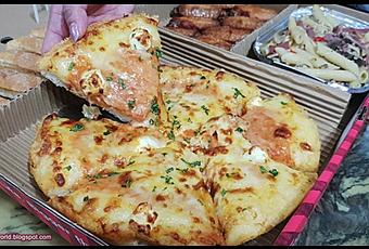 Regular 9” Cheesy 7 pizza are available for dine-in at $23.50 and delivery or takeaway at $25.50. Large 12” Cheesy 7 pizza are available for dine-in at $29.50 and delivery or takeaway at $33.20.