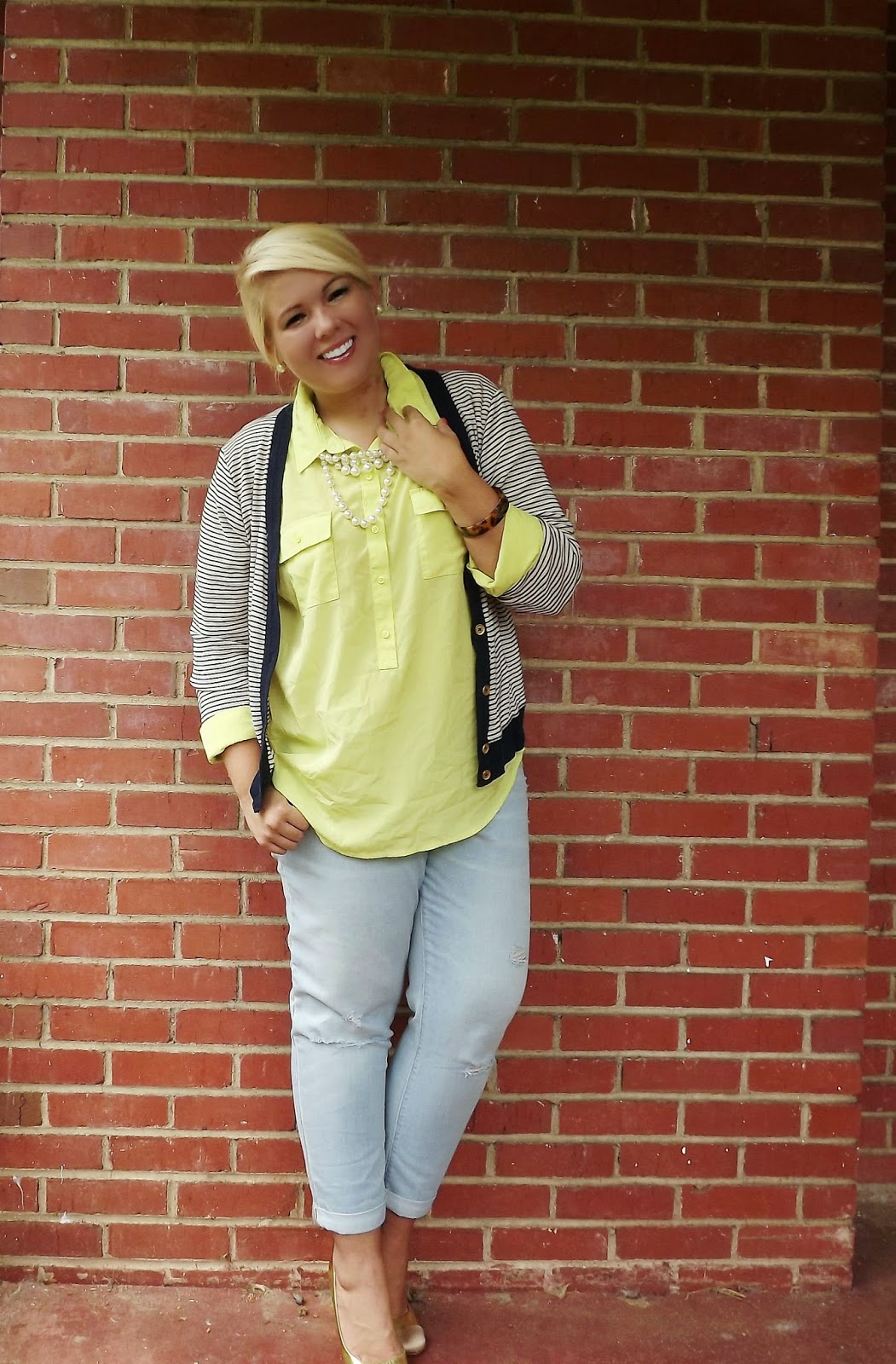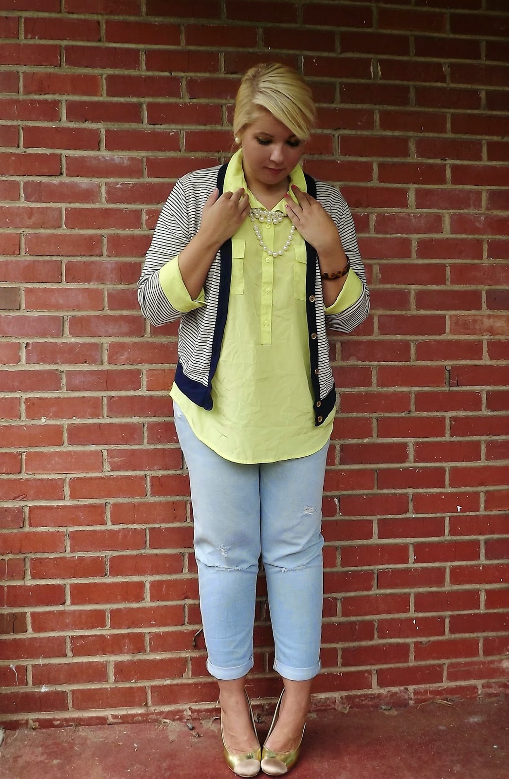Outfit: Cardigan- J.Crew, Blouse- Old Navy, Boyfriend Jeans- Old Navy, Heels- J.Crew, Necklace- J.Crew, Bangle- Farm Basket I'm not going to lie. I wasn't one for neon for a long time. There's a right way and a wrong way to wear it and I'd like to think I've finally figured that out. Add some navy, gold accents, and a print to contrast it...and viola...the perfect neon accented ensemble. I love the way the stripes look with the neon and how it almost makes the outfit look classic. The boyfriend jeans are obviously another favorite of mine. They are just too perfect. They give every look a more relaxed feel, but still compliment the pieces you've chosen for the outfit. The cap toed shoes I'm wearing are a favorite find from one of the J.Crew warehouse sales. I absolutely love how GOLD they are and the way that you can't take your eyes off of them. They're just so GLAM! xoBCC