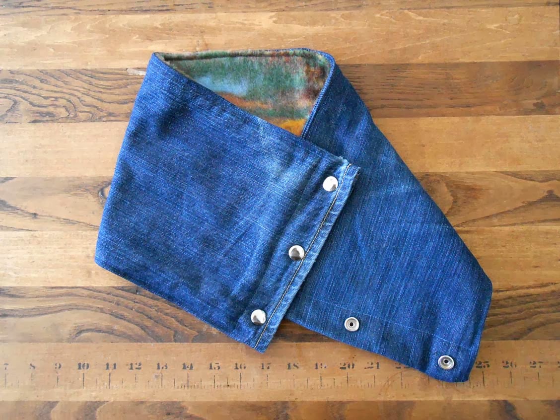 Materials:-old jeans-1 yd fleece (or flannel)-3 snaps