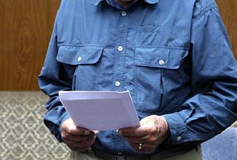 An 85 year old US citizen detained in the DPRK since 26 October 2013 reads a statement in front of a DPRK official (Photo: KCNA).