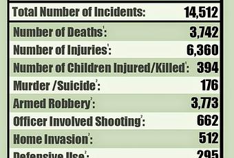 Also:Total incidents includes all gun violence, not just where injuries/ death occur. Things like armed robbery, home invasions, defensive use, hostage incidents with guns that end without holes.