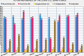 The senate race in Iowa is going to be very important this year. If the Republicans want to take over the majority in that legislative body, they will need to win this seat. But that is turning out to be tougher than expected. Right now the race is a dead heat between Democrat Bruce Braley and Republican Joni Ernst (41% to 40%). There are three Independent candidates and a Libertarian in the race, but the combined support for all four is only about 5% -- not enough to have much effect on the race.