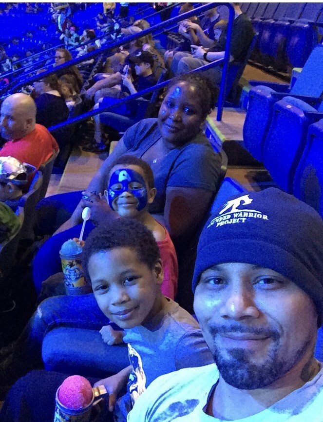 Army National Guard veteran Jason Bowden and his family gather during Marvel Universe Live