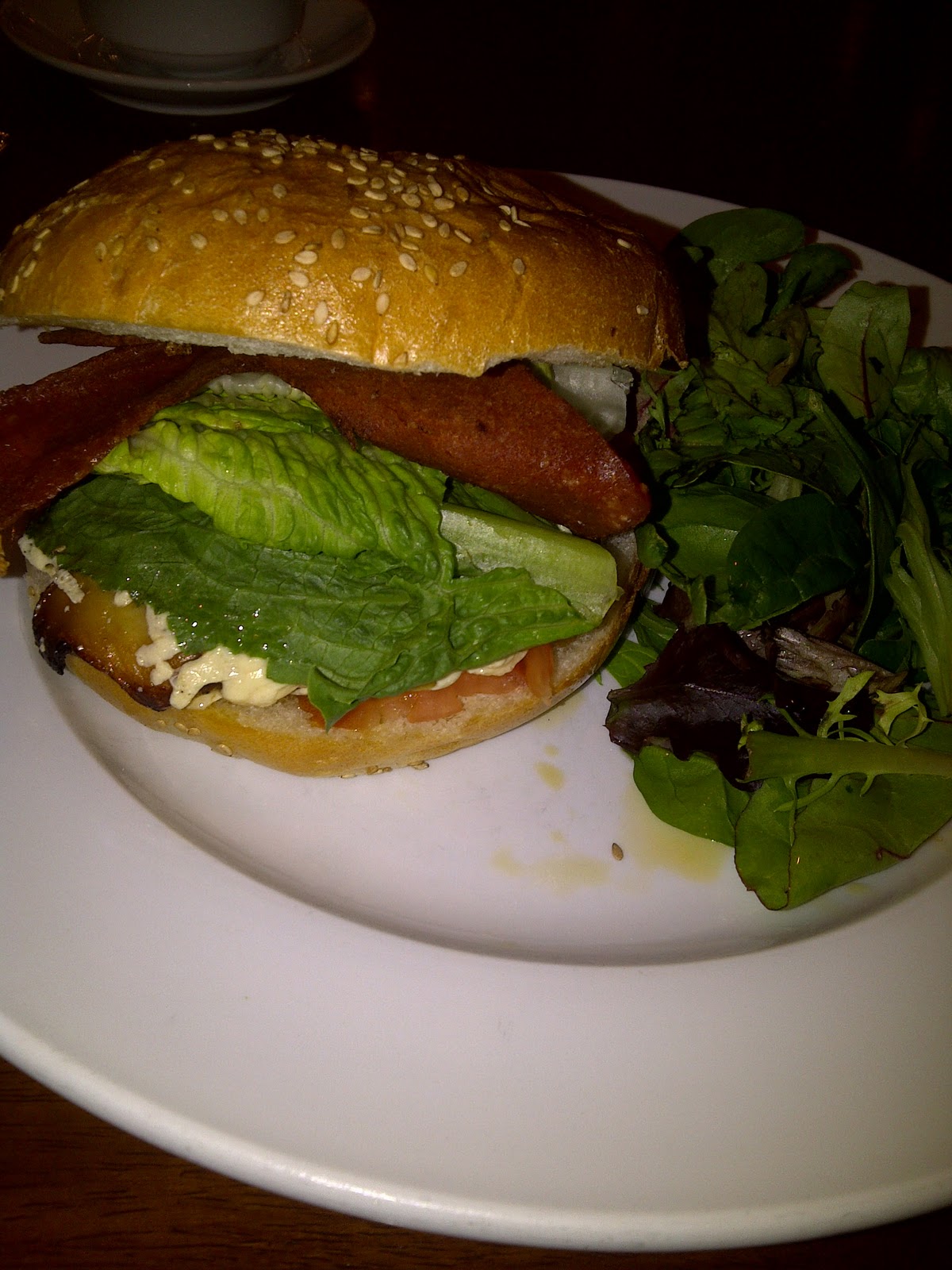 I hadn't eaten breakfast so I did glance at the french toast, tofu scramble, and blueberry pancakes, but it was nearly 1pm and I was looking for lunch. There were plenty of main courses, like seitan scaloppini, crispy thai tofu and pasta bolognese, and of course a number of salads, but to eat a salad here seemed like a wasted opportunity. We all decided to go for the sandwiches. One of my friends ordered the soy chicken cutlet tomato, lettuce, avocado (really more of an avocado spread) and chipotle aioli with sweet potato fries, and the other ordered a BLT with crispy Southern fried tofu, tempeh bacon, lettuce and tomato on multi grain with regular fries. I broke down and ordered the soy bacon cheeseburger...I couldn't remember the last time I'd had anything remotely like that: a vegan burger topped with carmelized onions, vegan soy cheese, sauteed mushrooms, lettuce and tomato (hold the aioli as I'm allergic to chipotle.) I cannot express to you how phenomenal it was! Flavorful, juicy, and just the right mix of tender onions and mushrooms with the crispy bacon...if I lived closer I'd be back tonight!