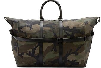The Valentino Camo Weekender bag is a good choice for any occasion except when camping in a forest, you will lose this bag in a forest. It is made from structured textile and leather with an olive green camouflage print. The leather trim and clips is black throughout. A zipper keeps the main compartment closed and the inner patch pocket can also be zipped to keep things separate. The bag includes removable leather shoulder straps that can be adjusted when used. A bit pricy though.