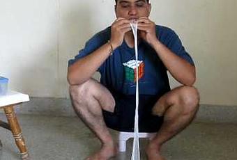 It may take some practice before being able to swallow the whole cloth. Try to remain relaxed, do not stress and the process will become easier. Do not hurry; just swallow the cloth slowly. Once the mind receive the idea the technique will soon be mastered. After swallowing the cloth, the stomach should be massaged by the churning process of nauli so that the cloth rubs and cleans the entire stomach walls.