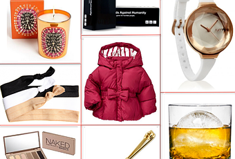 Faux Fur Infinity Scarf / Nice Laundry Socks / Echo Touch Studded Cuff Glove / diptyque 'Orange Chai' Candle / Cards Against Humanity / Rumba Time Orchard Gem Watch / Twistbands / Warmest puffer bow jacket / Naked Basics / Vincere Collar Tie Bar / Silicone Ice Sphere Molds / Joan of Arctic by Sorel / Chunky Knit Beanie / Bodum Eileen French Press