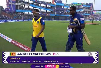 Angelo Mathews became the first player ever to be timed out in international cricket after he asked for a helmet change after walking onto the pitch, subsequently not being ready to face his first ball within the two minutes the ICC Playing Conditions allow. The strap of Mathews' helmet broke just as he was tightening it around his chin, during his final preparations before taking strike against Shakib Al Hasan. By this stage, almost two minutes had already passed since the previous batter Sadeera Samarawickrama had been dismissed.