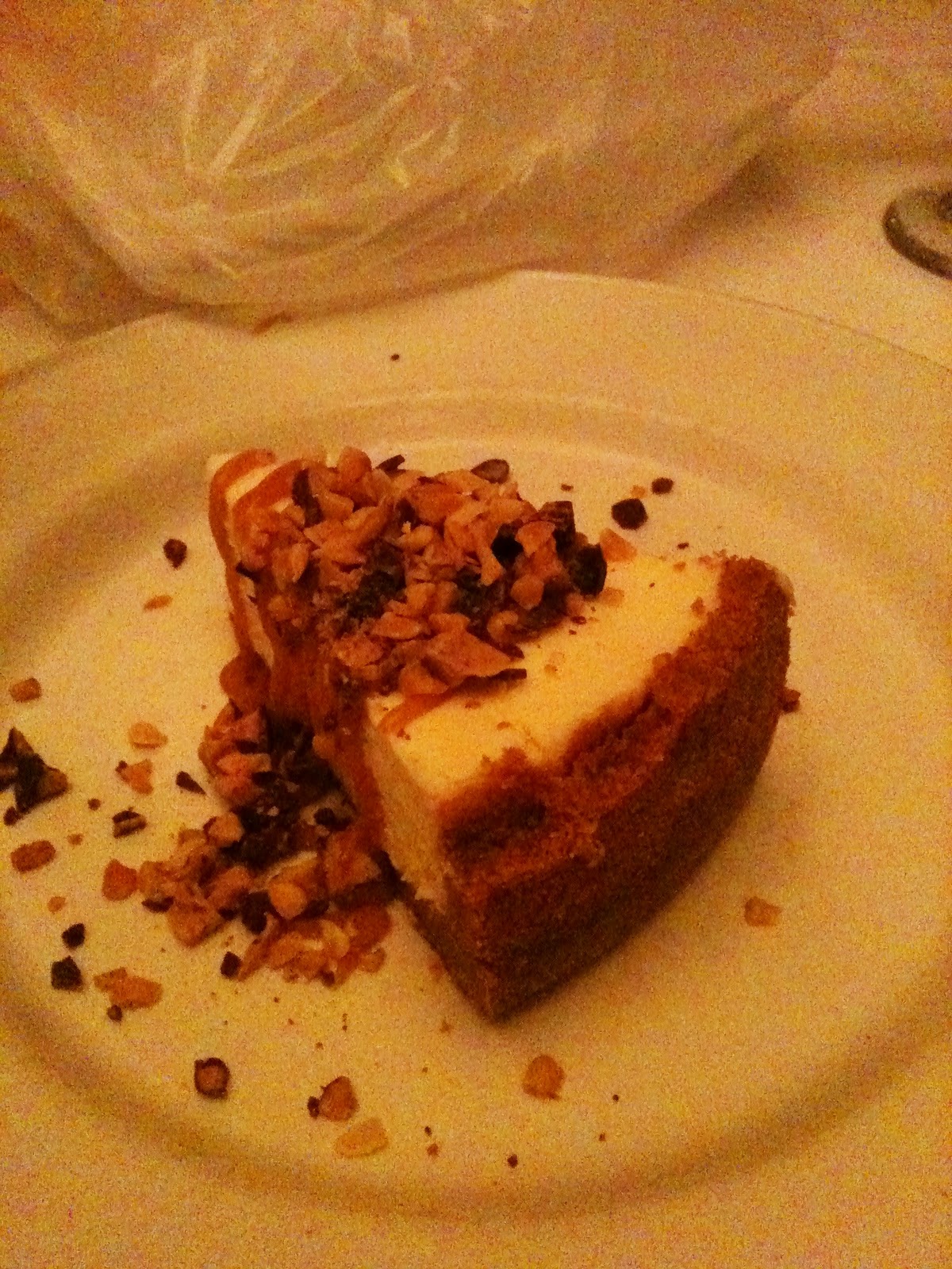 Then, as always, comes dessert. My sister and I opted for our own dessert to share while the rest of the table had the restaurant's signature dish: the chocolate truffle cake. It's a chocolate cake filled with a chocolate center and frangelico creme anglaise topped with vanilla ice cream, chocolate fudge and Heath Bar crunch. They dug in so fast I couldn't even get a picture! But I did manage to snap a picture before devouring the Heath Bar Crunch & macadamia nut cheesecake. My favorite part of this dessert was the crust. It wasn't flakey but instead it was extremely dense and filled with graham cracker flavor. Paired with the cheesecake and toffee bits, it was like taking a bite of perfection.