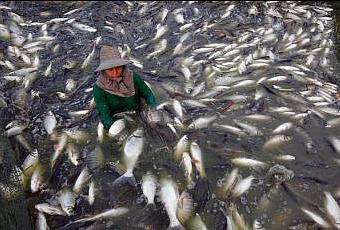 A Thai fisherman catches freshwater white tilapia fish at a fish farm in Samut Prakarn province, June 2012.