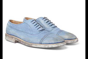 Maison Martin Margiela Washed-Leather Oxford ShoesLoyal readers, please forgive the Men's Shoe hiatus. However, your mens footwear temptations are back!! And with a design impresario! Maison Martin Margiela's Washed Leather Oxford are just what the summer ordered. Cool color for the season in a sun-washed blue that has a supple softness and goes great with everything from denim to cuffed khakis to abbreviated Bermudas. Available now at Mr.Porter.com.