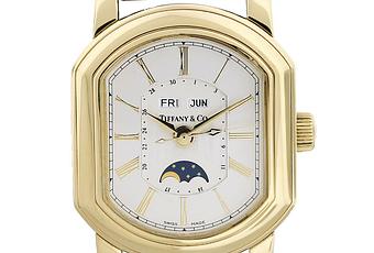 When you think of a luxury watch, the name Tiffany doesn’t immediately come to mind. Luxury jewelry? Well it’s typically one of the first. But Tiffany’s impressive watch collection is a quiet juggernaut of luxury timepieces. The same attention to detail that Tiffany’s fine jewelry creations have built into their DNA carried over to Tiffany watchmaking. Devastatingly gorgeous cases, dials and bracelets are a prerequisite, along with quietly powerful movements. For your consideration – the watch of the week, a Tiffany moonphase watch – a triple date in 18kt yellow gold with skeleton case back.