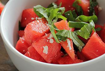 Just toss some watermelon chunks with torn basil leaves. Sprinkle with a bit of cotija cheese and lime zest. Finish with a drizzle of lime juice.