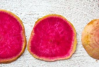 ME: What kind of radish do you think it’s called with this color? It’s green on the outside and pink on the inside?