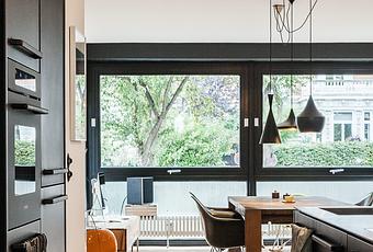 The island serves as a generous workspace for Dorothee to prepare dishes with her son Morten. The couple’s updates to the 1967 apartment in-cluded introducing large windows to the garden and covering the floors with an oak parquet to match the original flooring in a couple of rooms.