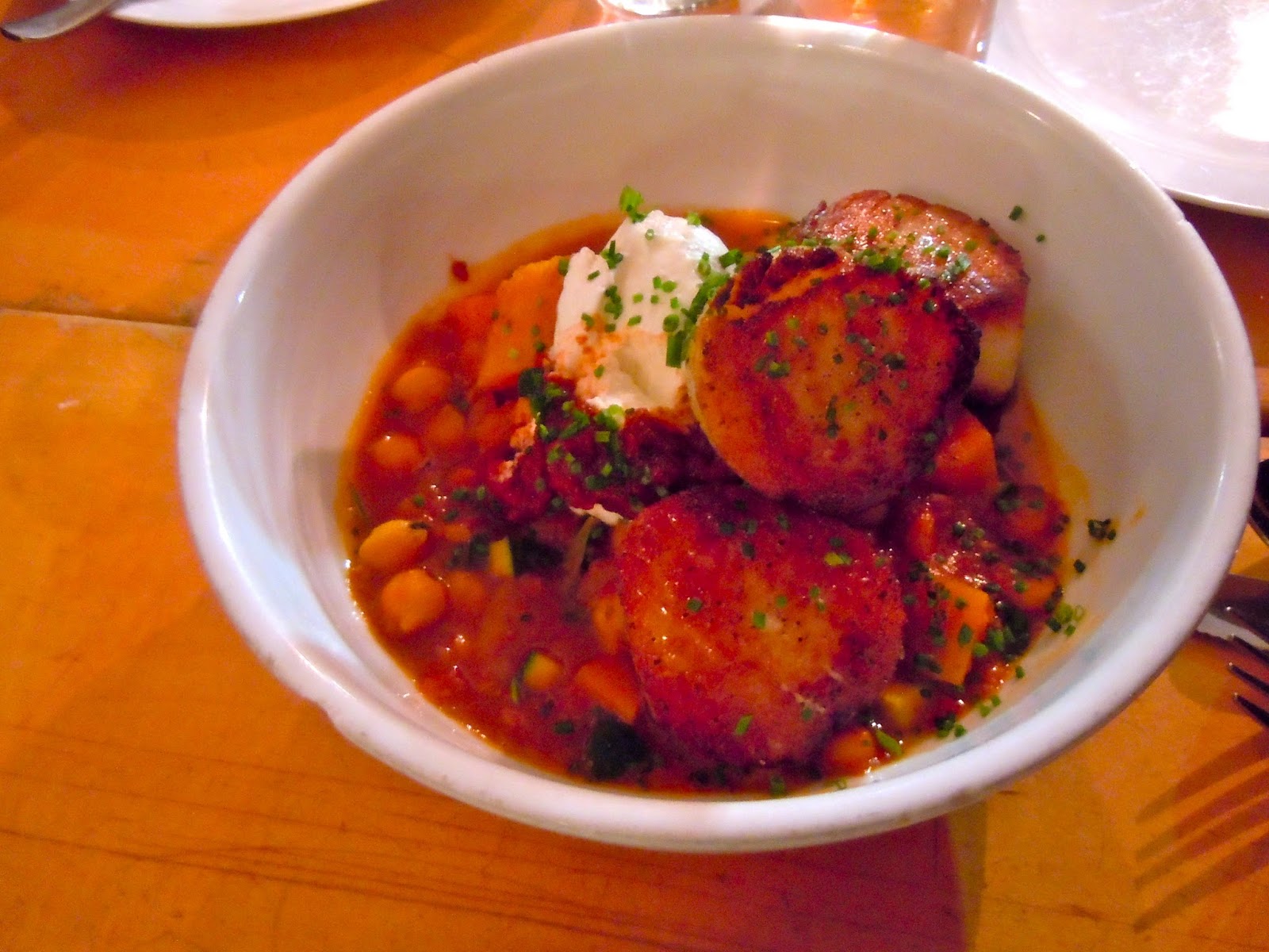 Seared Sea Scallops With Chickpea Tagine, Fayeh Yogurt and Harissa,