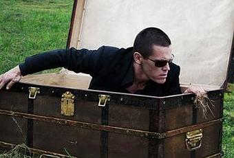 The poster does meet the plot details, however it is amazingly weird looking and something I've never seen in a movie poster. I mean a guy coming out of a chest in a grassy field. Tell me that's not weird.