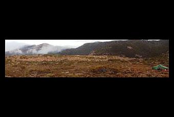 I woke up in the morning to rain on my tent and so slept in to 8.30. I had brekkie and coffee and broke camp by 10am. After a slow start I passed more possible campsites within an hour of my own. There was constant light drizzle and low visibility as I scrambled over rocks. The terrain got consistently easier the closer I got to Mt Weld and I passed a large cairn at 1.30om above Trout Lake. I made the summit around 2.15 and just as I rested at the top clouds began to clear one minor peak at a time along the range and I was given the chance for a photo or two. I camped on the moor 700m from the summit and the evening was clear and the views spectacular.