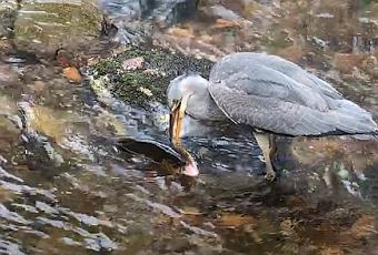 I don't know if this is funny, or just fun. As I was walking over a creek on a bridge, I saw a blue heron down below so I stopped to film him and all of a sudden he flew and then landed in the water and was flapping around. I thought he had gone mental until I saw he had a fish in his beak. The fish must have been about a foot long and they thrashed about a bit before he let the fish go in a small pool of water then sat pecking at it a bit. I think he was waiting for me to go to eat it, so I left. But I got it all on film! It was the coolest thing, and I was telling the kids that I feel a bit like David Attenborough!