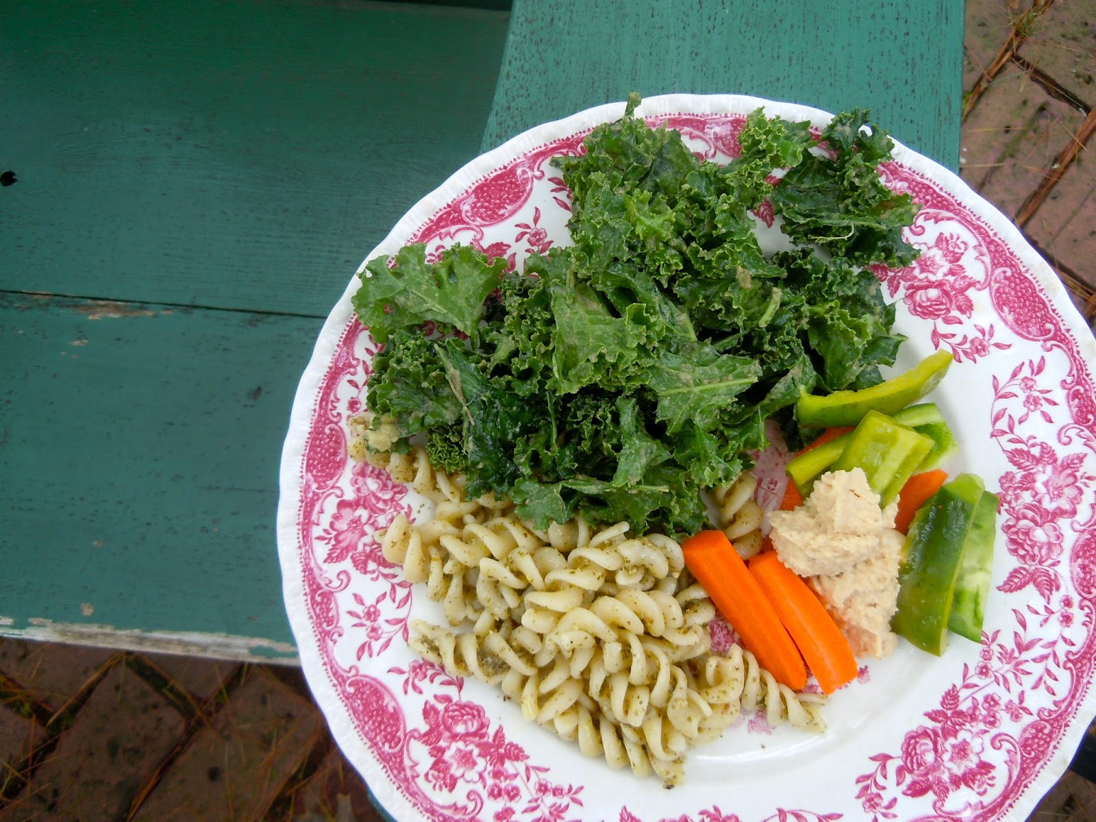 She also whipped up hummus and cooked pasta that would later be dressed in pesto. Leslie got to work on slicing vegetables while I took over preparing our simple kale salad. We enjoyed a lunch fit for healthy food bloggers on her front porch overlooking "the pond." I helped myself to seconds.