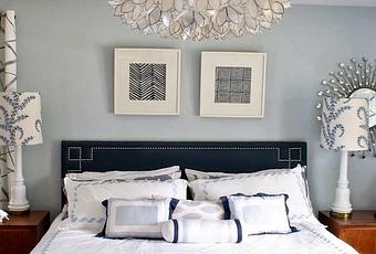 I painted the walls Brittany Blue by Ben Moore for a calm backdrop,and then added a lot more blue and navy. We recently upgraded to a king size bed and got the navy linen headboard is from Home Decorator's Collection. I will never go back to a hard wooden headboard after having an upholstered one... I'm a klutz and would always sit back and bang my head, so I consider this an investment in my brain cells.