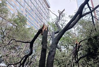 Trees damaged by Hurricane Beryl at Discovery Green in downtown Houston.The hottest question around the Houston region on Tuesday — When will my power be back on?