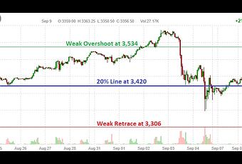 So of course we're going to bounce off the line we predicted we'd bounce off. The question is – how much? Here's where the 5% Rule™ gets a little tricky because there's two zones we're looking at. One is easy, that's simply the total drop from 3,600 (we give them the extra 12 points) to 3,300 and that's 300 points so we expect 60-point bounces to 3,360 (weak) and 3,420 (strong) and, since 3,420 is our 20% line – that's going to be a very serious win/lose line for the S&P 500.