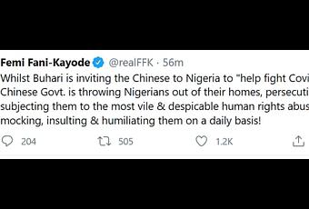 ”Whilst Buhari is inviting the Chinese to Nigeria to “help fight Covid 19”, the Chinese Govt. is throwing Nigerians out of their homes, persecuting them, subjecting them to the most vile & despicable human rights abuses & mocking, insulting & humiliating them on a daily basis!’.’