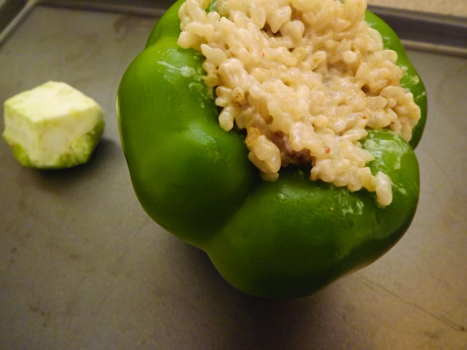 What you'll need:-One pepper (or more depending on how many you're making)-1 package of Trader Joe's Brown Rice (microwaveable makes it easier)-1 Jar of Tostito's Queso Blanco Cheese Sauce (yes I cheated a little)-Onion Powder-Garlic (because YUM)-Ground Turkey -Olive Oil-1 Baking Sheet-1 spoon-1 Knife-1 Frying Pan/ Cooking Pan How To:Step 1: Start the stove and place the cooking pan over one of the burners, turn it up to Medium-High. Drizzled olive oil over the cooking pan until it's about half way coated. Step 2: Place in the raw ground turkey. Let cook until it begins to appear cooked.Step 3: Take a spatula and begin to chop the turkey and flip it to cook it through.Step 4: Sprinkle garlic powder over turkey to give it that extra YUM. (don't overdo it. three shakes should do the trick) Step 5: While that is finishing cooking, microwave the brown rice. (the Trader Joe's rice usually takes about 3 minutes) Step 6: Place the turkey on a paper plate to cool. Rinse the cooking pan.Step 7: Place the cooking pan back on the burner. This time cover the pan a quarter of the way with olive oil.Step 8: Pour the package of rice into the pan (it should still be set to medium-high)Step 9: Shake the onion powder over 3 times and the garlic powder over the rice 3 times. That should be perfectly seasoned. Sometimes you can add a bit of black pepper to give it kick. Step 10: While the rice is cooking further, microwave the queso blanco to heat it up slightly.Step 11: Once the cheese dip is melted, pour about half the jar into the pan with the rice and mix it in well.Step 12: Proceed to mix in the ground turkey to the rice and cheese.Step 13: Preheat the oven to 400 degrees on bake.Step 14: Cut out the top of the pepper (while the rice is finishing cooking) and spoon out the pepper seeds so that the inside and top of the "cap" of the pepper are free of seeds. Step 15: Turn the stove burner off. Then take the spoon and spoon the rice into the pepper until it is full. Step 16: After the pepper is full, place it and it's cap onto the baking sheet and place it in the oven.Step 17: Bake the pepper for 13-15 minutes depending on how fast your oven heats. Step 18: Your Mexican Stuffed Pepper(s) is ready to serve! Step 19: ENJOY! xoBCC