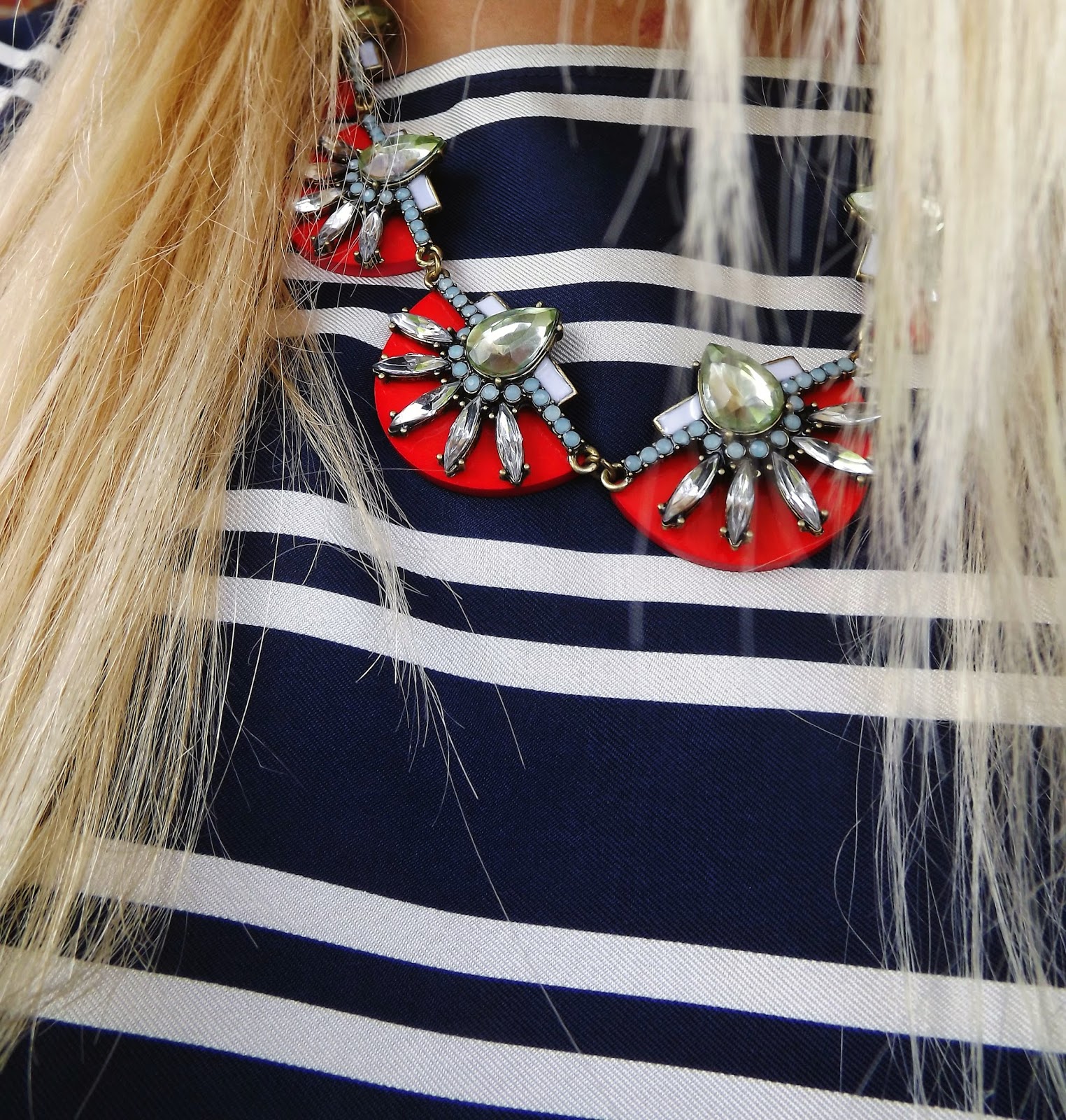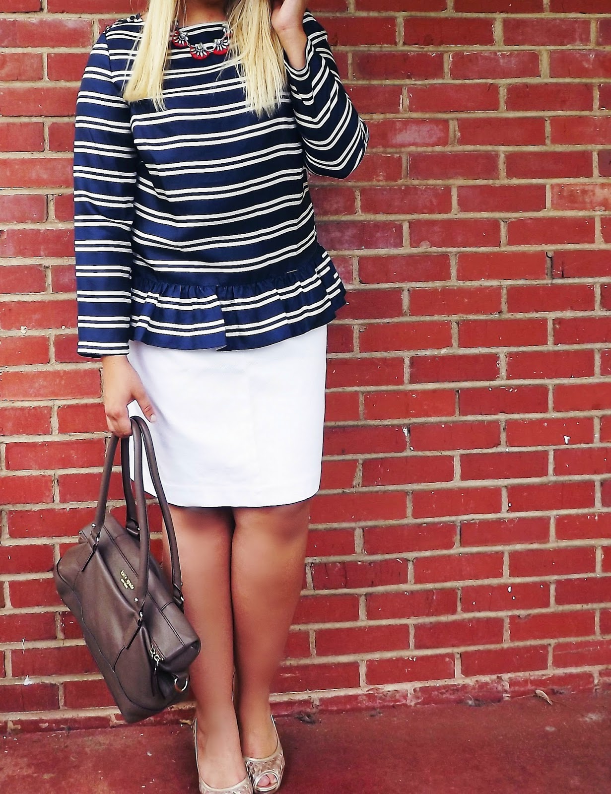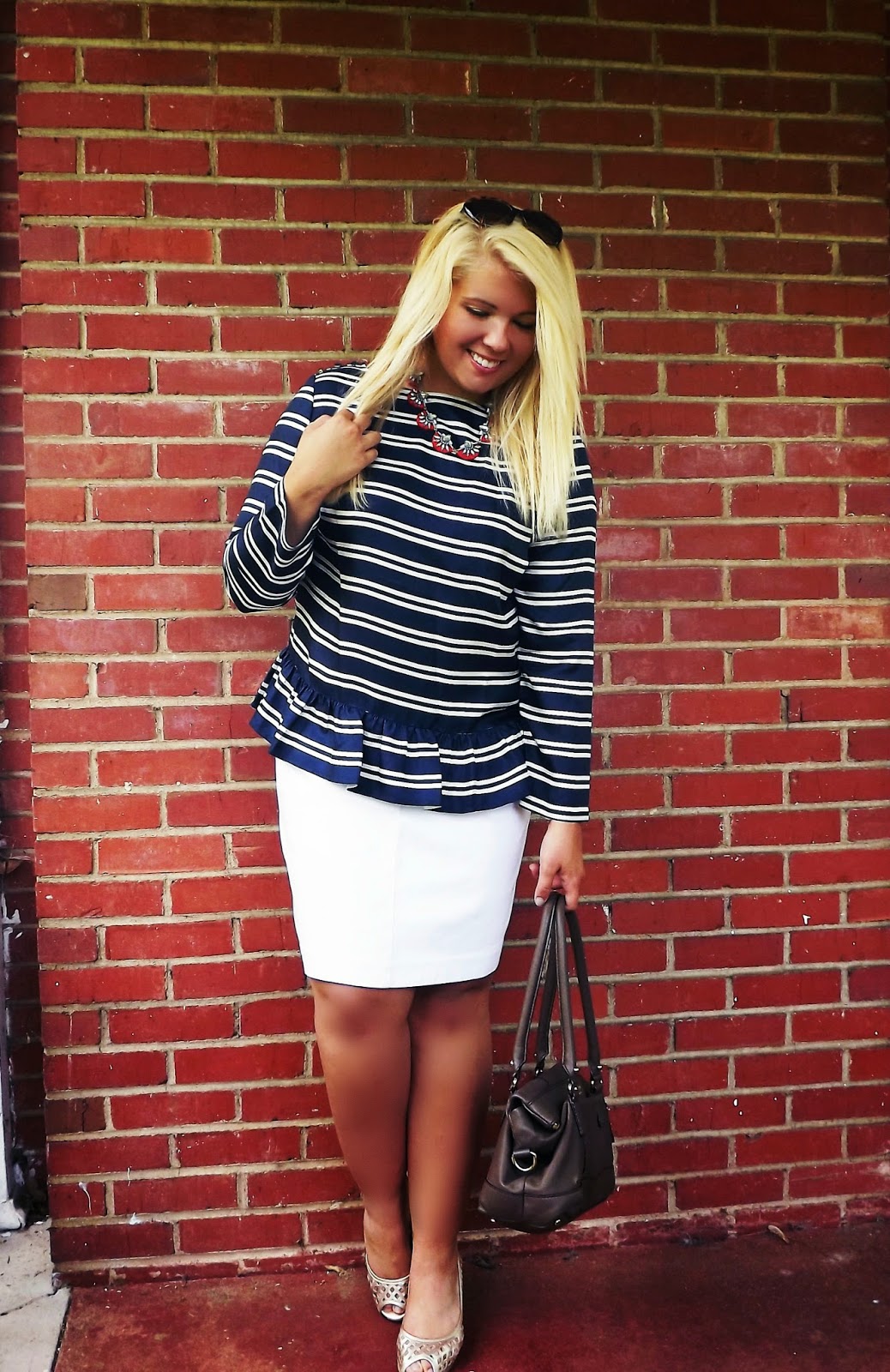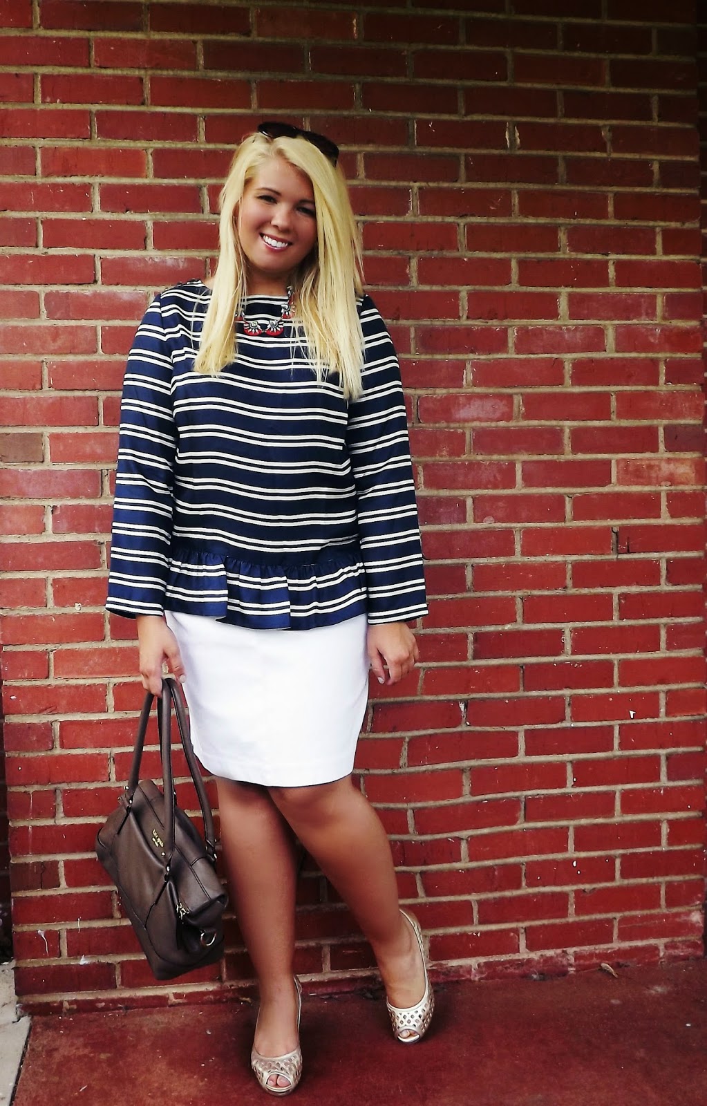 This skirt barely stayed up while it fit perfectly when I first bought it. I went down a jean size (yes it's true!) And my clothes fit better than ever. With some hard work I am conquering my struggles and making myself who I've always wanted to be. Life is full of things that are going to try to bring you down but if you don't let them, no one can stop your rise. I LOVE this outfit and the way it lines and accentuates the body in the perfect proportion. The skirt, I have to get taken in, but the way that the peplum lays, hits my hip perfectly. This outfit would be perfect for a business look or for a mid week brunch! I just wore it to run some errands around town, but it was just perfect. The necklace from Baublebar is the perfect accent to the navy and white look, with an aztec sort of charm. By laying the red, blue, and green hues over the navy; the necklace stands out more and makes more of a statement than it would pairing it with something with similar hues. For the cooler late spring weather, this look is perfect. By covering my arms but leaving my legs bare, I am able to stay protected from the cooler breeze of this weird weather but not get overwhelmed if the heat starts to kick back up. xoBCC