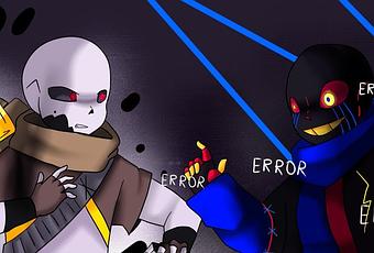 Error Sans was created in the Anti-Void as a glitched skeleton. Error Sans is the product of a determination/power-play by an alternative Genocide Sans who ends up throwing himself into the empty void, where, from loneliness, and bleakness, he turns into what he is now – Error Sans.