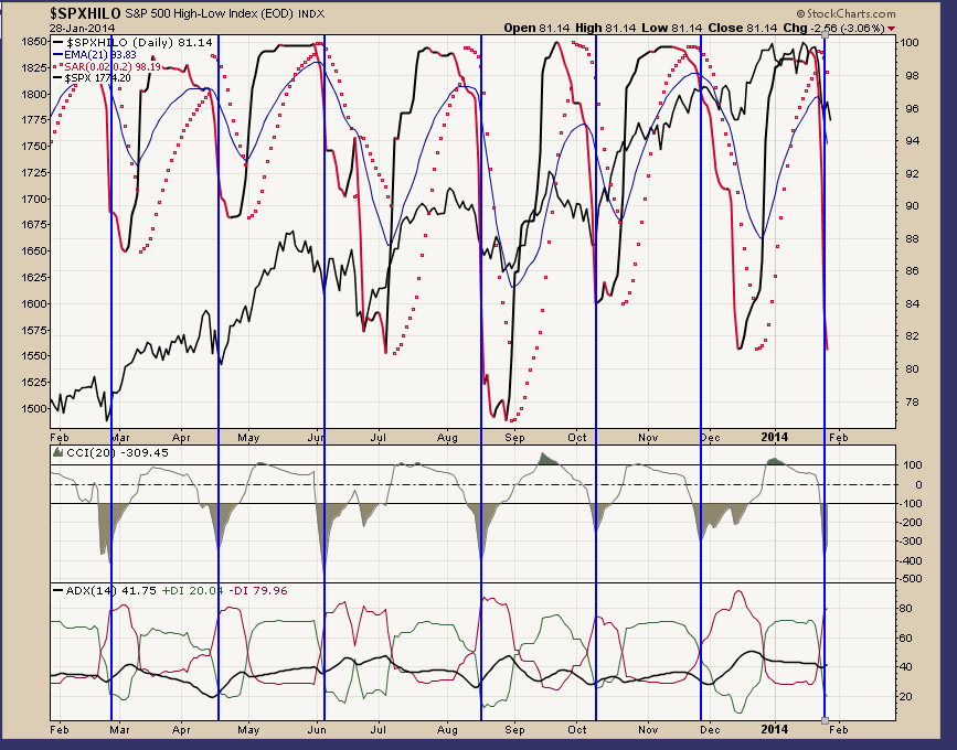 The above is why I am not assuming anything. As noted, we could cascade down from here. However, this has not been a good place in recent history to be short. The blue line on the trend chart is the 21 EMA. I think (hope, I suppose) that we should touch that blue 21 EMA either with a ramp back up, or by consolidating until it catches up with us down here. Just a thought.