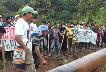 U’was along the Caño Limon-Covenas oil pipeline running through their ancestral territory. Photograph: Asou’wa