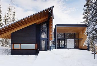 Douglas fir walls and beams extend to the exterior of a weekend house near Golden, British Columbia. Designed by Bohlin Cywinski Jackson and Bohlin Grauman Miller Architects, it was designed for an active family that likes to hit the slopes. A chalet-like pitched roof emphasizes its cabin feel.