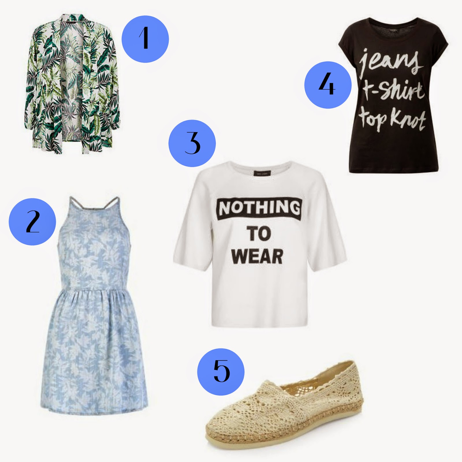 Palm Leaf Kimono | Denim Skater Dress | Nothing To Wear Oversized TopJeans T-Shirt Top Knot Top | Crochet EspadrillesWith summer on its way I've been spending my spare time scrolling through various websites looking for some new summer clothes and New Look is where I had most success. I came across a lot of floral prints. crochet and khaki which seems to be the trend for Summer '15.First two items I didn't think would ever catch my eye as I'm not a very floral person but surprisingly they did. The Palm Leaf Kimono screams summer and puts me in the mood to book a flight to a hot destination and wear this whilst strolling around the island. The Denim Skater Dress is something different to anything I've ever owned. I love the floral print as its quite subtle and not too in your face. The next two tops are 100% me! I love a good slogan tee, especially when the slogan applies to my life. I think the Nothing To Wear slogan would apply to almost every girl. The fact that it's oversized is why I had to include it in my wishlist, I can't stand skintight clothes in the summer. 90% of the time I am sporting the topknot as I can't be bothered to do anything with my hair so this next top was first on my wishlist. Lastly are these Crochet Espadrilles, I always hear people rave about Espadrilles but have never owned a pair myself and these just look so cute!Have you found any cute clothes for the summer yet?Instagram / Twitter / Bloglovin'