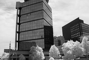 This last image looks into the campus of the Colgate Rochester Divinity School. It’s (neo)Gothic tower has always attracted me; this time, I got to exploit my infra red camera to good effect on the sky and foliage.