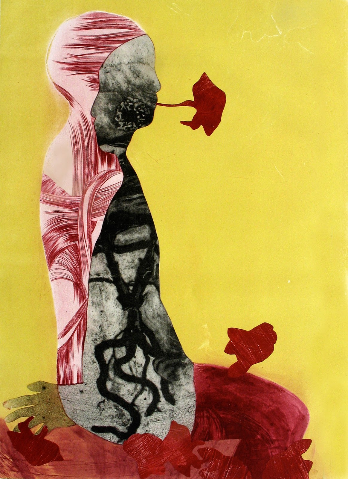 Most importantly it was / is authentic. The colours were appealing and yet not 'outstanding' they were just integrated. I also liked that she used 'empty space' as an element in her work. Her use of a 'silhouette' figure immediately invites the viewer to place themselves within the picture space....with its curved forms and layers.It seemed to me that there is a kind of 'open-ness' in these 'hands-on' very directly-created intaglio prints.Left a print from her "Sympathetic Fibers" series