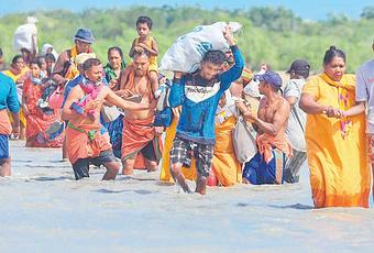 A group of Hindu devotees from the North on the yearly pilgrimage ‘Pada Yathra’ making a long trek of over 92 kilometers through Yala and Kumana National Park to reach the historical Kataragama Devalaya. Picture by Sulochana Gamage