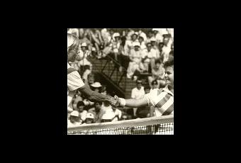 Jane Forman shaking hands with Martina Navratilova on Wimbledon's Center Court in 1986