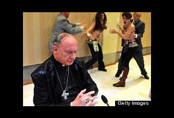 Four FEMEN members entered an auditorium at the ULB university in the Belgian capital, holding signs that said "Stop Homophobia" and "Anus Dei Is Coming." Flemish newspaper De Standaard reports that Léonard was giving a lecture on blasphemy and freedom of speech when the bare-chested protesters poured water over his head.