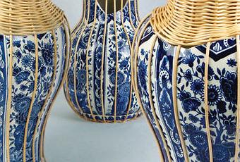 Daniel Hulsbergen (Design Academy Eindhoven, graduated), Centerpiece series, 2010. These sculptural vases meld two traditional Dutch crafts, the printed Delft Blue vase and handcrafted wicker braiding. This is complemented by a very modern ethos: sustainability through reuse.