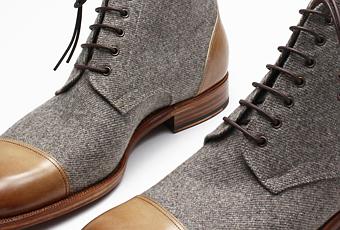 The Zerozeroone Sohi is smart and stylish take on the classic Derby boot, great for either dressing up or dressing down. The two-tone upper features burnished full grain calf leather complemented with a gray wool body, soft mid tan calf leather lining and hand welted 8.5mm leather sole.